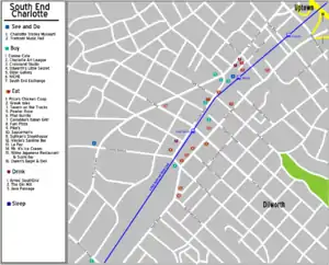 South End is well connected to other parts of Charlotte. South Blvd connects to I-485 south of the city, giving visitors from that direction an easy inlet to the district. Visitors from the Uptown area may travel down South Blvd by car (the easiest way is to take S. Brevard until it becomes South Blvd after the I-277 junction). A cab is also a reasonable option, since the district is only about a mile from Uptown.