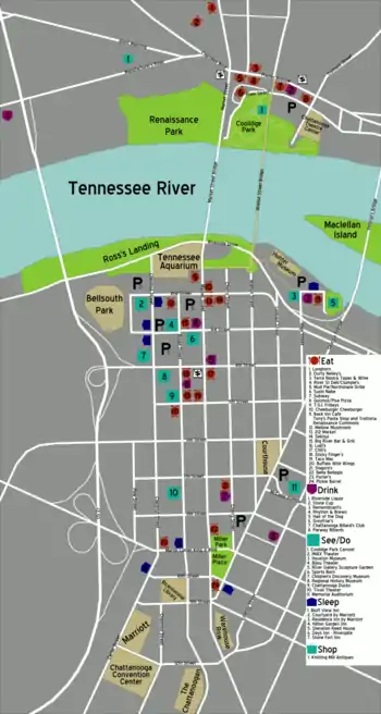 • Chattanooga Area Convention and Visitors Bureau - 2 Broad Street, next to the Aquarium. The Chattanooga Visitors Center provides maps of downtown, sample itineraries, attraction tickets, and more. Official Chattanooga Tourism site.