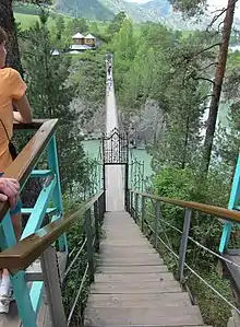 - Patmos Island — Downstream of the Katun from the mouth of the Chemal River, not far from the hydroelectric power station, is the picturesque rock-island Patmos, standing in the middle of the river. On it stands the women's skete of John the Theologian of the Barnaul Znamensky Monastery. The island is connected to the river bank by a pedestrian suspension bridge. An image of the Virgin and Child has been carved into the rock next to the temple. There's an old chapel, Ionno Bogoslavski.