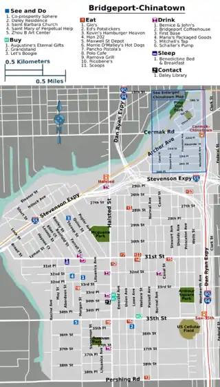 The Dan Ryan and Stevenson Expressway cut across the east and north of the district. From the Dan Ryan, take either of the 31st or 35th Street exits; from the Stevenson, take the Cermak Avenue/Chinatown exit for Chinatown and the Damen Avenue exit via Archer or 35th Street for Bridgeport. The main city streets are Halsted Street (north-south), and 31st St, 35th St, and Pershing Rd (east-west).