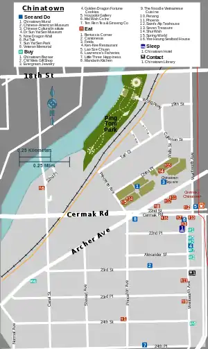 - π Ping Tom Memorial Park, 300 W 19th St. A riverside park with a Chinese touch, including a riverside Chinese pavilion and a bamboo garden. On a clear day the park has nice southwest side views of the Chicago skyline. The park offers many summertime events from movie screenings to the very popular dragon boat races. Check the Chinatown Chamber of Commerce's website for details.