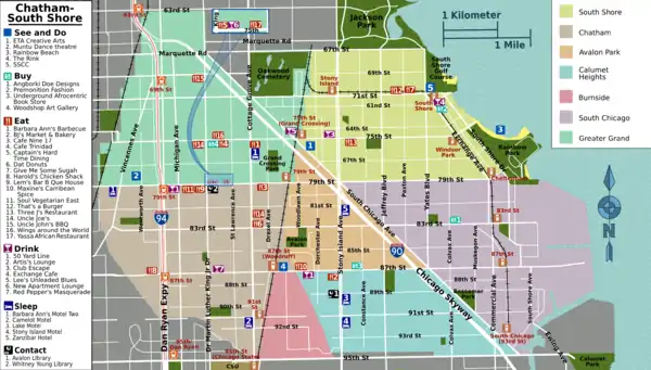 South Shore is home to a lively arts scene, largely thanks to the ETA Creative Arts Foundation and the magnificent South Shore Cultural Center. It is also home to one of the city's best and least known beaches, Rainbow Beach. Incidentally, many of Chicago's most prominent black politicians call this community home. Its main commercial strip runs alongside Metra's Electric Line on 71st St and is literally lined with kids hanging out when school's not in session.