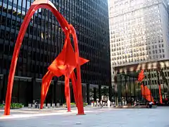 - 🌍 Federal Center (van der Rohe, 1964/1975), 219/230 S Dearborn St. This plaza includes Mies' Dirksen Federal Building and Kluczynski Federal Building (built eleven years apart), with a low-rise post office enveloped in their sleek black lines. But the buildings are not quite as famous as the gigantic red constructivist flamingo statue by Alexander Calder in the plaza in front of the post office. An adventurous raccoon may have set a raccoon world climbing record by reaching the scaffolding on the 36th floor in 2006.
