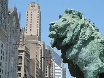 - 🌍 Carbide and Carbon Building (Burnham Brothers, 1929), 230 N Michigan Ave. A beautiful Art Deco tower covered in dark green terra cotta and adorned with a gold terra cotta leaf at the pinnacle. It is rumored that the architects (the sons of city planner Daniel Burnham) intended the building to resemble a bottle of champagne. It's in great condition today, and can be visited through one of the bars in the lobby of the hotel inside.