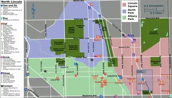 Also listed in this article are Albany Park and North Park, two diverse residential neighborhoods to the northwest of Lincoln Square. Albany Park in particular is one of the most diverse in Chicago, and even the USA - many of residents are immigrants and they come from all over the world. There’s no better place in Chicago to find late-night Guatemalan dinner or Filipino dessert. Kedzie Avenue has an amazing run of authentic Middle Eastern restaurants, and a major Korean population lives and works on the stretch of Lawrence Avenue known as "Seoul Drive." The Brown Line makes it easy to skip the over-priced tourist restaurants downtown and enjoy a quick culinary tour at a fraction of the price you’ll find by your hotel — unless you’re staying on the Sin Strip (see Sleep).
