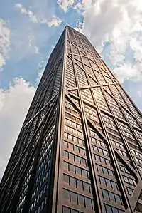 - π 875 North Michigan Avenue (formerly John Hancock Center), 875 N Michigan Ave. 1127 ft. The John Hancock Center is the seventh tallest skyscraper in the U.S. and, if you include its very long antennae, the eighth tallest in the world from base to pinnacle. The building was a pioneer of several architectural features designed by Skidmore Owings and Merrill, with Fazlur Khan, a Bangladeshi-American structural engineer. According to the logic of the structural expressionist school, these features are visible and emphasized, lending the building its originality. Most notable is the building's pioneering use of X-bracingβif you don't know what this means, you will when you see it. There is a great view from the Observation Deck on the 94th floor and a fine restaurant on the 95th. Floors 45 through 92 contain more than 700 condominiums.