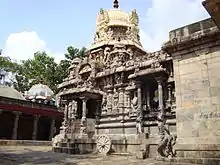- Chidambaram temple (Thillai Nataraja Temple). The temple complex is spread over an area of 40 acres (160,000 mΒ²) in the heart of the city. The main complex is dedicated to Shiva Nataraja and the complex contains shrines to deities such as Shivakami Amman, Ganesh, Murugan and Vishnu in the form Govindaraja Perumal. The golden tiled roof for the Chit Ambalam (the vimanam) was laid by the Chola King Parantaka I (907-950 CE). Donations of gold and jewels have been made by various kings, rulers and patrons to the temple from 9th to 16th century and by the British. In the Chidambaram temple, Shiva is said to have manifested himself in the form of sky.