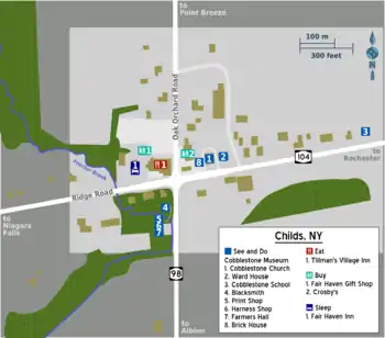 - π Fair Haven Inn, 14369 Ridge Rd, Albion (adjacent to Village Inn), β +1 585 589-9151. Check-in: 2PM, check-out: 11AM. This is the only lodging in Childs. The Tillman family opened it several years ago in an 1837 Greek Revival house. The house has four bedrooms, and there are four more "Creekside" bedrooms in a nearby building. The rooms in the house have a more antiquated feel, while the Creekside rooms are more modern and more spacious. Each room has two double beds and a private bath. No smoking or pets. $80, with meal packages available that provide discounts at the Village Inn.
