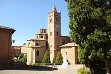 The abbey sits approximately 110 metres below the hamlet on the hillside. It is a 1-km drive or a steep 1,600-step walk to the abbey from the centre of town, and if you climb down, you also have to climb back up, which is challenging on hot summer days. So if you are coming from the hamlet, you may prefer to take a short drive if you have a car. However, if you are coming from Asciano or Buonconvento, as most visitors do, you can drive right up to the abbey's parking lot if you have a car or walk uphill from the bus stop.