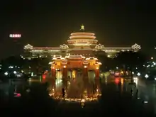 - 🌍 Great Hall of the People (重庆人民大会堂) (Access through pedestrian tunnel from Zengjiayan metro station on line 2.). Chongqing's Great Hall of the People (and the People's Square in front of the Hall) is an architectural symbol of Chongqing City. Its construction began in 1951, but its design is traditional and mirrors those of China's ancient classical dynasties. It somewhat resembles an enlarged version of the Temple of Heaven in Beijing. The People's Square was only completed in 1997 and is decorated with trees and flowers. The ground of the square is paved with smooth marble tiles; there is magic music fountain; at the southern end of the square stands a stage for performances in the open air. You may see thousands of people dancing on the square in the numerous beautiful lights in the evening. The building is to be seen from the outside, no need to pay the admission fee. ¥10.