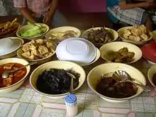 - 🌍 Nasi Lengko H. Barno, Jalan Doktor Cipto Mangunkusumo (next to Nasi Jamblang Mang Dul), ☏ +62 812 2277 3991. Daily 8:00-22:00. Nasi lengko consists of steamed rice, tempeh and tofu, and bean sprouts, covered with peanuts sauce, garlic chives, and sweet soysauce on top. It is usually served with mutton satay and tapioca starch crackers.
