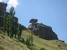 Clarens is part of the scenic Highlands Route and is surrounded by mountains. The Rooiberge is the range encompassing the village, whilst further towards the southeast are the Maluti mountains in shades of purple and blue. All around are the sandstone cliffs with their multi-coloured layers - these horizontal strata are a characteristic feature of the area. Many homes in the Clarens Valley are made from or clad in sandstone.