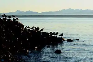 🌍 Washington State Ferries (Clinton ferry terminal), ☏ +1 206-464-6400, toll-free: +1-800-843-3779. A ferry connects Clinton and Mukilteo on the mainland north of Seattle. This run is popular with commuters and should be avoided at peak commuting times if possible. 20 minutes one way; departures every 30 minutes. Island Transit has a bus stop at the ferry terminal.