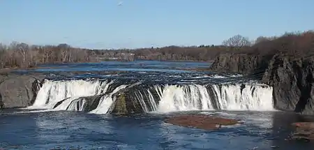 - π Cohoes Falls, Mohawk River. 90 feet (27 m) high, 1,000 feet (300 m) wide, this bifurcated waterfall is somewhat of a very poor man's Niagara (that is, with much less water, no rainbow and a much shorter drop, but still impressive) and well worth a detour by itself. It is part of the Harmony Mills Historic District and just a bit past Harmony Mill No. 3, off of N. Mohawk St.