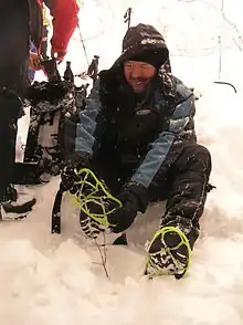 Frostbite means damage caused to skin and other tissues due to freezing. Although the mechanism is different, the effect resembles burns, and like sunburn, the condition might not get noticed until too late. This is especially true during physical activity such as trekking, or in windy weather. In theory, cooling the skin is painful, but cooling also lessens sensation. It is easy to ignore the beginnings of numbness, and then damage can occur unnoticed. Therefore awareness and active checking are needed. Watch out for white spots on your fellows' skin. The nose, ears, chin and cheek are the body parts most easily affected, especially in windy weather. Fingers and toes may also get frostbitten, but you will more easily notice them getting uncomfortable. However, when exercising in an already adrenaline-packed situation such as mountaineering, it is easy to ignore the numbness or pain, particularly in toes. Frostbite, if left unchecked in such a situation, leads to permanent damage and even amputation in a similar manner as third-degree burns. Active checking is necessary, and wiggling fingers and toes will help keeping them warm. Fingers can be placed in armpits to warm them. Children will often fail to report that their fingers are cold or damp; active checking by an adult is necessary.