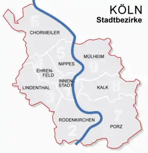Cologne is divided into 9 districts (Stadtbezirke), numbered from 1 to 9. Stadtbezirk 1, called Innenstadt ("inner city"), is probably the one most tourists will spend all of their time in, as it contains most of the city's points of interest. It is also the only district that lies on both sides of the Rhine, as it includes Deutz. Districts 2, 3, 4, 5 and 6 are on the western bank of the Rhine, and districts 7, 8 and 9 on the eastern bank, surrounding the Innenstadt.