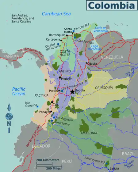 | Andino Rugged Andean landscapes and altiplanos containing Colombia's two largest cities, Bogotá and Medellín, beautiful national parks, and coffee plantations. |