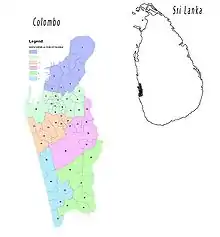 Colombo is divided into numbered administrative districts. They're used for postal services but also for indicating where in the city a place is, and some businesses include them in their address information. There are 15 districts in Colombo. Outer districts have higher numbers – see the adjacent map.