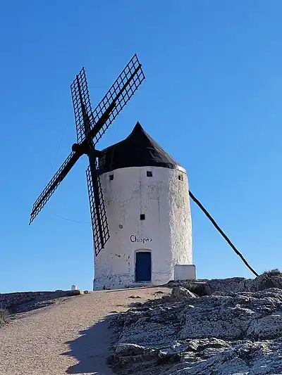 Windmills are a common sight in the La Mancha area, especially in areas too dry for the installation of watermills, and immortalized by Don Quixote, the masterpiece of Miguel de Cervantes. Similarly to the castle, with which they share a beautiful skyline, they have creative names, mainly from Don Quixote but not restricted to it, such as Chispas (Sparks), Alcancía (Moneybox), Rucio (with a wine exhibition, souvenirs, and visitable working machinery; +34 925 095 144), Espartero (probably named for one of the greatest Manchego statesman, it houses an exhibition of Toledo handcraft), Clavileño (decorated with pictures and props from Andorra), Bolero (with visitable machinery and also housing a Tourism Office), Mambrino (drinks shop), Sancho (one of the original windmills, with working original machinery), Vista Alegre, Cardeño, Caballero del Verde Gabán (exhibiting several Quixote editions, and housing a gastrobar) and Mochilas (Backpacks). Most of them are quite new (19th century, but some of them are from the 16th century. From a total of 13 mills, 12 survive to this day.