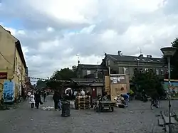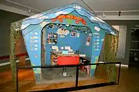Smoke-away? The most famous tourist draw to Christiania is no longer there, but rather on the National Museum in downtown. The old colourful hash-stalls which used to line Pusher street, was demolished in 2004, in an attempt to gain permanent rights to occupy the area from the right wing government. One of them, the signature blue "Ryg med hjem (Smoke-away)" booth, was salvaged, and is now on display in the modern collection of the National Museum, complete with furnace, sales tables and instruments to sell marijuana, but without the authentic goods.![]() |