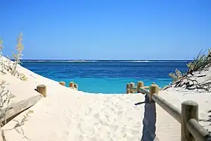 The beach around the bay is sandy with shallow entry, and the lagoon is calm. The tidal range is only about a metre so the currents are seldom more than a gentle onshore drift, and the absence of motor boat traffic or jet skis adds to safety. But there are no lifeguards, and watch out for jellyfish (not usually a big problem, especially in the winter high season (roughly June to August). Much of the area around the beach is actually too shallow to swim, but you may find a decent strip of deep-enough water between the beach and the edge of the coral growth, or above the coral growth in deeper parts (be careful not to hurt yourself - though the coral here is mostly dead, it's still very hard and sharp!).