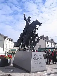 - π Owain GlyndΕ΅r statue. life-size bronze statue of the prince mounted on his battle horse