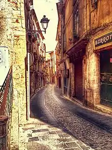 The historic core, better known as Cosenza vecchia , reflects the common facies of the ancient hillside settlements, dominated by steep, narrow and winding alleys along which stands a building made up of small buildings and stately palaces, perched on the hill Pancrazio, subsequently on the Guarassano and Torrevetere hills, to the left of the Crati, while the houses on the remaining surrounding hills, Gramazio, Triglio, Mussano and Venneri, are very rare.