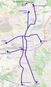 The Cottbusverkehr GmbH (Cottbus Transit Authority) operates a network of four streetcar lines and eight primary bus routes in the city, in addition to three nighttime bus lines. Late night service runs from 21:00 to 04:30 daily. It's operated by three bus lines (2N, 3N, 4N). They busses always meet at the train station.