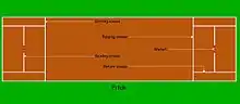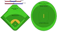 Cricket is played outdoors on a large circular or oval field. The main part of the field is grass, mown like a lawn, in the centre of the field is the rectangular pitch, which is often mown shorter. At either end of the pitch is a set of wickets 22 yards (20 m) apart - three vertical wooden sticks with two small wooden bails placed on top. Cricket is played with a leather ball, similar in size to, but much harder than a tennis ball, and a wooden bat with a flat face usually made of willow. During the match the batsman stands in front of the wicket and "defends" it as the bowler aims for it.