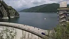 The dam was not filled until December 1965. Vidraru Accumulation Lake was born between the flanks of Fruntea and Ghiţu Mountains. This lake is home to the waters of the River Capra, Buda and its affluent River Doamnei, Cernatul and Vâlsanul, Topologul, Valea lui Stan and Limpedea. The total area of the Vidraru reservoir is 870 hectares, the length is 14 km, and the maximum width is 2.2 km in the Valea Lupului - Valea Călugăriței.