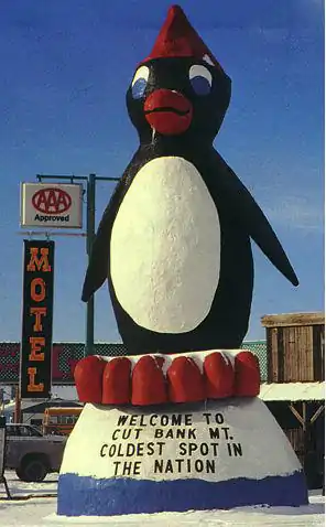 - 27-foot tall talking penguin. At the east end of Cut Bank.