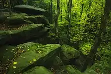 The park encompasses 51 mi² (134 km² and 33,000 acres) along the banks of the Cuyahoga River, spanning from the major metropolitan areas of Cleveland and Akron and into the hills of the Allegheny Mountain range. The diverse landscape, including sandstone ledges, 70 waterfalls (most notably Brandywine Falls), rolling hills and river gorges, can be viewed from 186 mi (299 km) of trails.