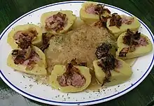 Another common kind is bramborové knedlíky (potato dumplings), the slices are smaller, more yellow in color, and are also always served as a side-dish. A typical combination is roasted meet (pork or lamb for example) with spinach and bramborové knedlíky or duck with sauerkraut and bramborové knedlíky (or combination of bramborové and houskové knedlíky). Less common are chlupaté knedlíky (hairy dumplings, but there are no hairs, don't panic), which are not sliced but cooked in shape of balls. They are also usually served with roasted meat and either sauerkraut or spinach.