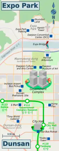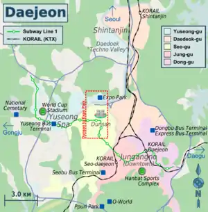 - Dunsan is not a gu, but is the central business district and where you will find the majority of the shops and restaurants. The area is served by three stops on the subway: City Hall, Government Complex and Galma stops 111, 112, 113 respectively. For more upscale shopping and accommodations head over to the Yuseong hot springs resort town (Yuseong-gu), which is the northwest part of the city, and is serviced by the Yuseong-spa subway stop. The former city centre is located in Jung-gu and serviced by the Jungangno subway stop.