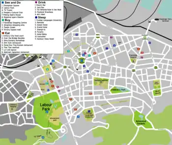 - 🌍 Labour Park (劳动公园; Láodòng Gōngyuán) (South of Qingniwa shopping area). 06:30-18:30. The largest park in Dalian containing a number of attractions, including a small aviary area, a few man made lakes and an amusement park (which, like the one in Xinghai Square, is overpriced and fairly uninteresting). Off season the park is free and can be a pleasant place to take a stroll, but it is probably not worth paying to get in during the holiday periods. ¥10-15 during holidays, free the rest of the time.