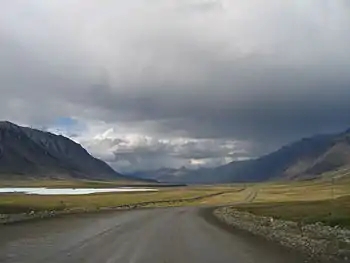The climate of the regions this highway traverses range from subarctic to polar. During the summer months (Jun-Aug), the average maximum temperatures range from 70°F (21°C) to 50°F (10°C) with average minimum temperatures ranging from 50°F (10°C) to 35°F (2°C). Travel on the highway during the months of May and September is a bit colder, although travel along the highway is not considerably more dangerous during these months. Average maximums during these two months are approximately 35-60°F (2-16°C) and average minimums 40-15°F (4 to -9°C). The temperatures given are average, be prepared for temperatures as much as 20°F (11°C) outside of said ranges. While the highway is open all year (more trucks traverse it in winter than summer!), travel from late September through early May is frigid and lethally cold through the heart of winter. Temperatures below -40°F (-40°C) are very common and temperatures as low as -60°F (-57°C) are certainly possible—before factoring in windchill. The record low windchill in Deadhorse was -102°F (-74°C) on 28 Feb 1989! A chart record of windchill at ARCO's facility in Prudhoe Bay on 13 Jan 1975 shows -128°F (-89°C). Such temperatures are lethal in less than one minute if you are not prepared for them. Unless you are experienced with polar temperatures, including its effects on vehicles and gear, do not attempt to traverse the highway between November and March!