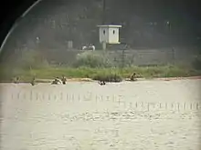 - North Korean Border (北韩边界; Běihánbiānjiè). As the boundary between China and North Korea, the Yalu River flows over 300 km between the countries. Yalujiang Park is the best place to view North Korea, see the public sculptures, the swimming platforms (Warning: do not swim into North Korea), and possibly take a fast boat ride up and down the river along the border. There are remnants of an original railroad bridge across the river, bombed and destroyed by the Americans, a few km north of the Friendship Bridge, with a large stone-carved book inscribed in Chinese as a monument onshore.
