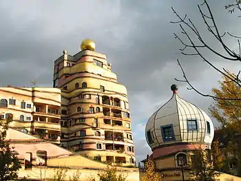 - 🌍 Waldspirale (Forest Spiral), Waldspirale (next to Friedberger Straße, between Bad Nauheimer Straße and Büdinger Straße). The huge Hundertwasser house was finished in 2000. It is a wonderful example for Friedensreich Hundertwasser's (the famous Austrian architect and painter) colourful architectural designs. The residential building itself has an interesting spiral shape, "green roof" and of its 1048 windows no two are the same.