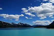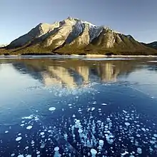 - π Abraham Lake (35 km west of Nordegg along Hwy 11). An artificial lake along the North Saskatchewan River and Alberta's largest reservoir. The lake has the blue colour of other glacial lakes in the Rocky Mountains. During the winter, trapped methane from decaying plants on the lake bed causes frozen bubbles to form under the ice on the lake's surface. This phenomenon creates bubbles that become trapped within the ice, in suspended animation, just below the surface as the lake begins to freeze.