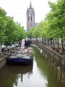 - 🌍 Oude Kerk (Old Church), Heilige Geestkerkhof 25, ☏ +31 15 212-3015. Closed on Sundays. This is Delft's oldest church, built in 1246. The interior of this church is excellent. Famous Dutchmen are buried in this church, including: Piet Hein, Maerten Tromp and Johannes Vermeer. The Old Church leans out considerably over the Oude Delft canal. When the tower was built the canal had to be moved away from the church as the tower would have been half in the water. During the building works it became apparent that canal-half of the base soil was not firm enough to support the tower. To compensate for the tilt the upper part of the tower was built with a compensating counter curve. See New Church, since it's one ticket for both, but only the New Church tower may be climbed.