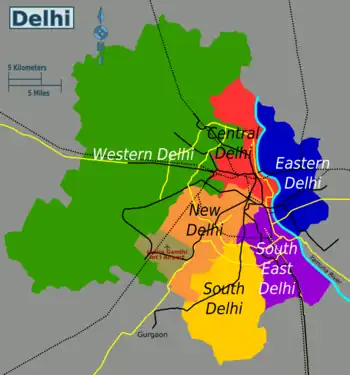 Delhi is officially divided into 11 districts. For travel purposes, some government districts are combined into bigger districts in this guide. The colours of the districts represent the colour of the main metro line that travels through them: