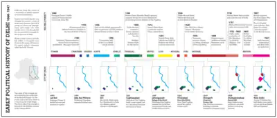 - 🌍 Qila Rai Pithora — Founded in perhaps the 11th century as a city named "Lalkot" under Hindu rule, in the current Mehrauli area. In around 1180, Hindu ruler Prithviraj Chauhan expanded this city and renamed it Qila Rai Pithora. Some of the ruins of the fort ramparts from this period are still visible around Qutb Minar and Mehrauli.