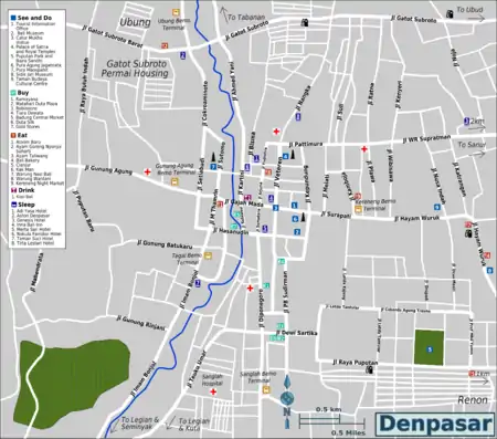 - π Batubulan, 6 km northeast, for points central and east: (Besakih, Candidasa, Kintamani, Klungkung, Padangbai, Ubud).