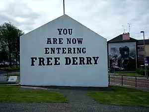 - π Free Derry Corner is the junction of Rossville Rd / Lecky St with Creggan Rd. A monument marks the bounds of "Free Derry", the fiercely nationalist quarter of town during the height of the Troubles. Building gable-ends around are painted with the "Bogside Murals" of political art, and another monument commemorates the peaceful protestors gunned down by the British army on Bloody Sunday. Google map sublimely calls it "Free Londonderry Corner", which is like marking the spot where the Boston Tea Party demanded the right to drink British tea. Today, it is co-opted for various political movements and memorials via permit at various times of the year, such as for LGBTQ2+ rights and Palestine.
