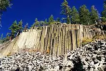 Devils Postpile National Monument is a United States national monument located in Madera County in the Sierra Nevada region of the state of California. Established in 1911 by presidential proclamation, Devils Postpile National Monument protects and preserves the Devils Postpile formation, the 101-foot high Rainbow Falls, and pristine mountain scenery. The Devils Postpile formation is a rare sight in the geologic world and ranks as one of the world's finest examples of columnar basalt. Its columns tower 60 feet high and display an unusual symmetry.