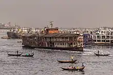Most ferries arrive and leave from the port of 🌍 Sadarghat. This area and its surrounding streets are unbelievably crowded, so allow plenty of time and keep an eye on your valuables. If arriving at the port, fight your way to the left on the frontage road and then make your first right; this turns into Nawabpur Road and leads north to the hotels. Even if you aren't staying in this area, it's easier to walk several hundred metres north to catch an onward rickshaw or taxi; the ones near the port are at a constant standstill.