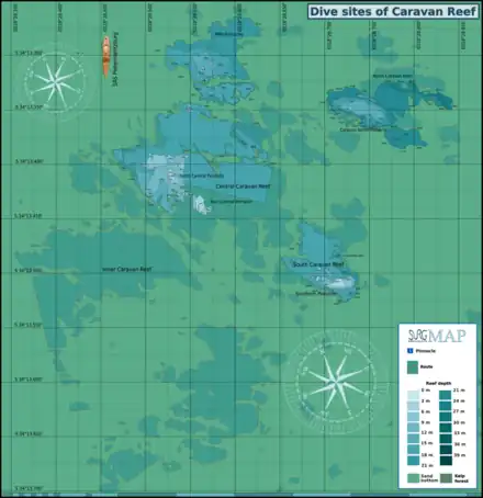 - Reef dive. Boat access only. Maximum depth about 21 m.