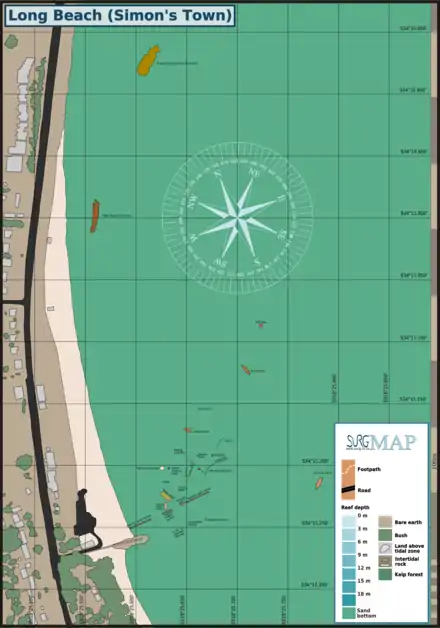 This listing of dive sites of the Cape Peninsula east coast is part of the regional guide for Diving the Cape Peninsula and False Bay which is intended to provide the already qualified scuba diver with information which will help to plan dives in the waters of the Cape Peninsula and False Bay, whether as a local resident or a visitor. Information is provided without prejudice, and is not guaranteed accurate or complete. Use it at your own risk. Expand or correct it when you can.