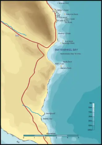 The shoreline and shallow reef at Smits Cliff is Table Mountain Sandstone, probably Graafwater series, while the offshore reefs at Smits Reef and Batsata Rock are Peninsula Granite. The unconformity is near sea level in this area.