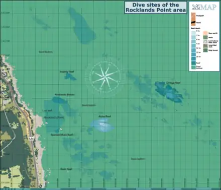 - Reef dive. Boat access only. Maximum depth about 16 m.